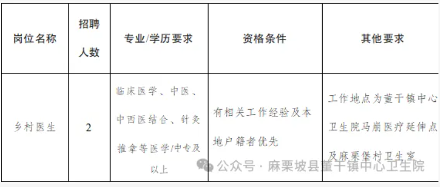 乡村医生2人。要求服从院内岗位调配及医疗服务延伸点工作安排,详见附件《董干镇中心卫生院公开招聘编外技术人员岗位计划表》。