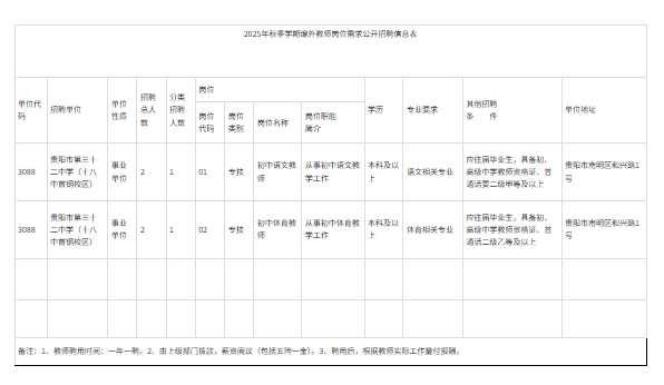 贵阳市第三十二中学(贵阳十八中首钢分校)位于南明区油榨街道和兴路1号,与贵阳市第十八中学融合办学,实行“两块牌子一套班子”的管理模式,师资统一调配使用。为进一步加强教师队伍建设,优化师资结构,严格遵循“公开、公平、公正”的招聘原则,确保选拔出德才兼备的优秀教育人才。坚持任人唯贤、事业为上、公道正派、严管和厚爱结合、激励和约束并重,严格依法依规操作,着力建设一支忠诚、干净、担当的教育力量。现公开招聘派遣制语文、体育教师各1人。招聘事宜公告如下: