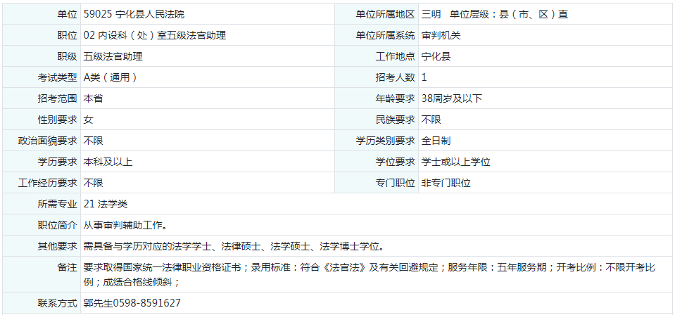 招考要求:2人(1男1女);38周岁及以下;专业:21.法学类;本科及以上;学士或以上学位;学历类别:全日制。