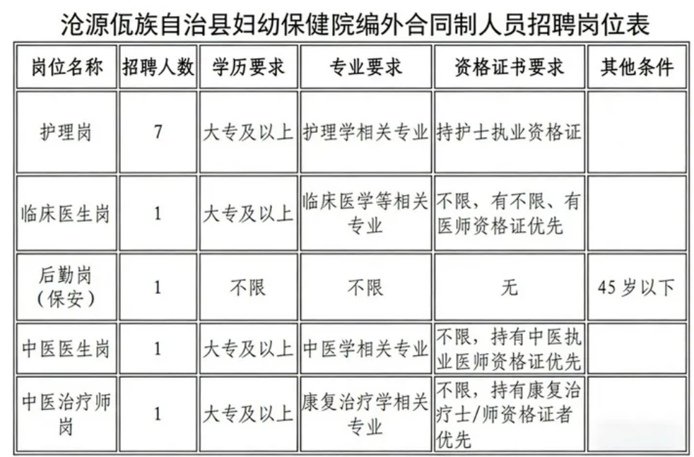 详见<<沧源佤族自治县妇幼保健院编外合同制人员招聘岗位表>>,满足其他条件者优先考虑录取。