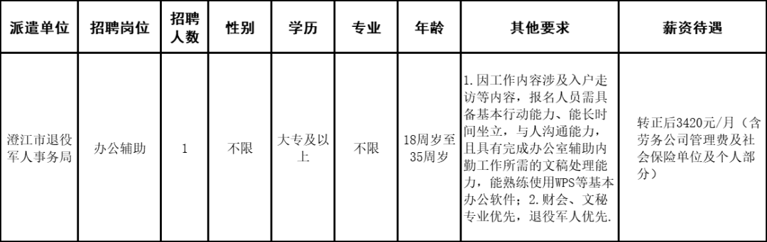 澄江市退役军人事务局因工作需要,委托澄江市启澄人力资源有限责任公司,面向社会公开招聘办公辅助工作人员1名,现将有关事项公告如下: