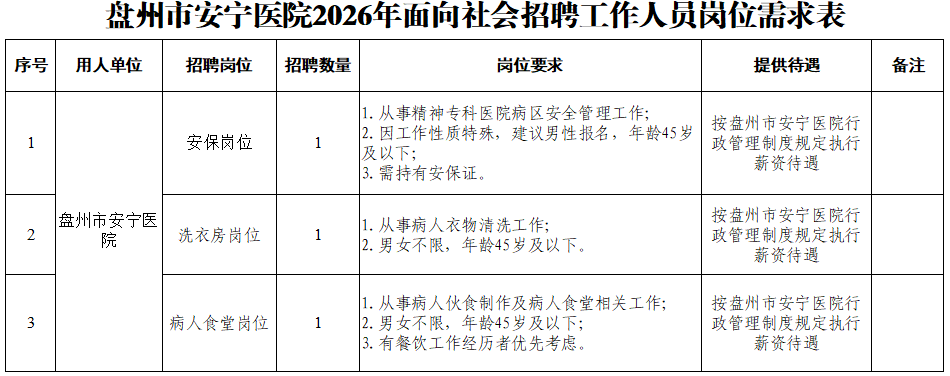 盘州市安宁医院2026年拟面向社会公开招聘安保人员1名、洗衣房工作人员1名、病人食堂工作人员1名,共计3名。具体岗位要求详见附件1《安宁医院2026年面向社会公开招聘工作人员人员岗位需求表》。