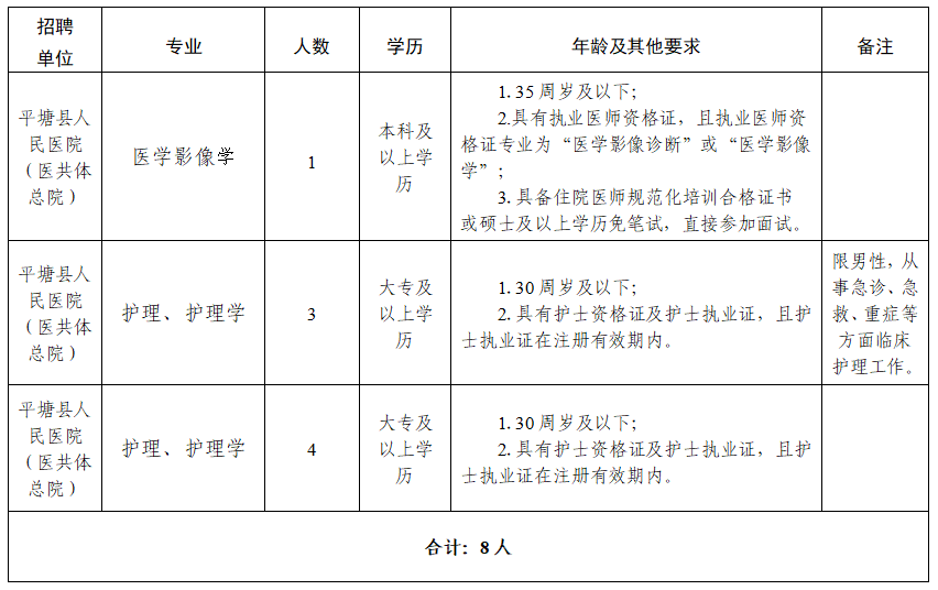 为提高平塘县人民医院医共体总院医疗服务质量和水平,结合工作实际,现面向社会公开自主招聘编制外专业技术人员8名,具体招聘事宜公告如下: