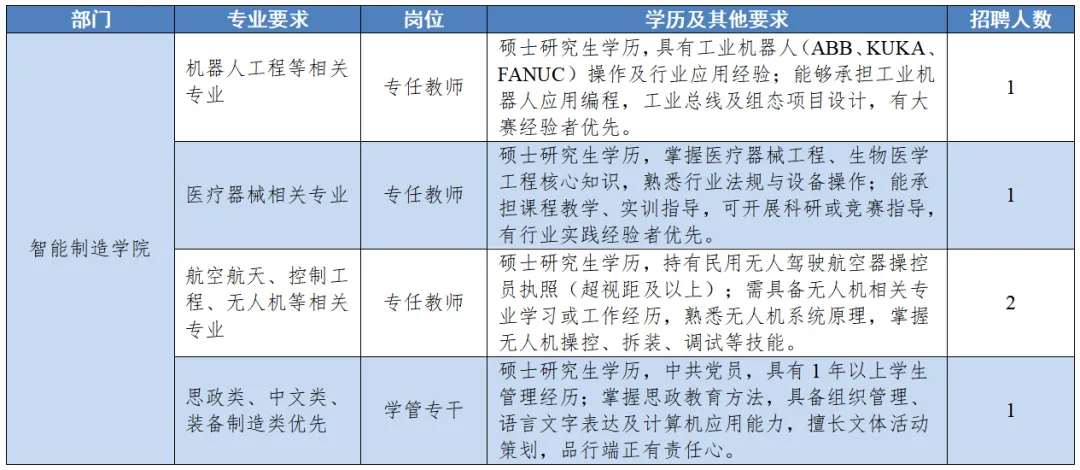 根据智能制造学院发展需要,2026年面向社会招聘5名教师。