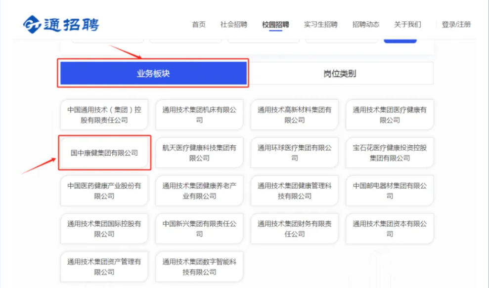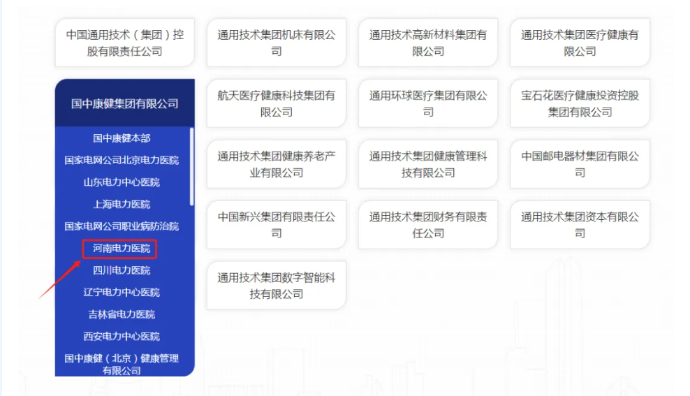 登录网址后选择校园招聘-业务板块-国中康健集团有限公司-河南电力医院,并选择相应岗位进行报名。