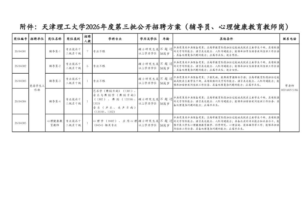 公开招聘方案于2026年3月5日在天津市人力资源和社会保障局网站人事考试版块(https://hrss.tj.gov.cn/jsdw/rsksw/)、天津市教育委员会网站(https://jy.tj.gov.cn)和天津理工大学人事处门户网站(https://rsc.tjut.edu.cn)公开招聘专栏发布。具体招聘岗位见(附件:《天津理工大学2026年度第三批公开招聘方案(辅导员和心理健康教育教师岗)》)。