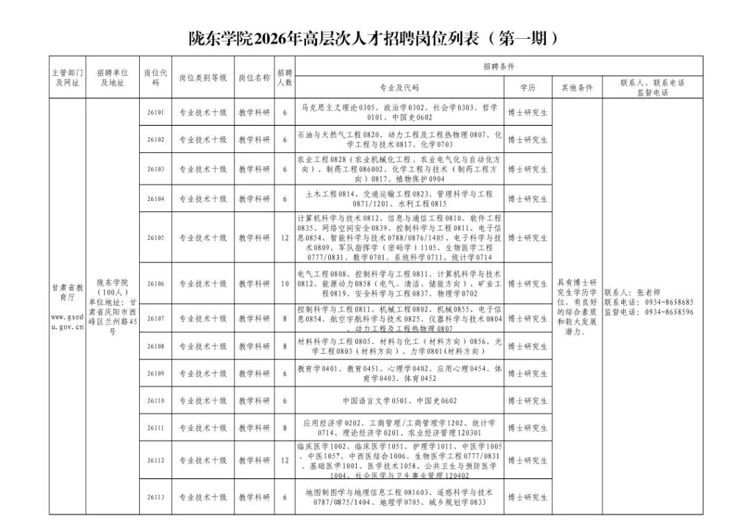 为深入实施新时代人才强校战略,促进学校教学科研事业高质量发展,陇东学院以优厚待遇诚聘海内外高层次人才100名,现将2026年公开考核招聘高层次人才(第一期)有关事项公告如下: