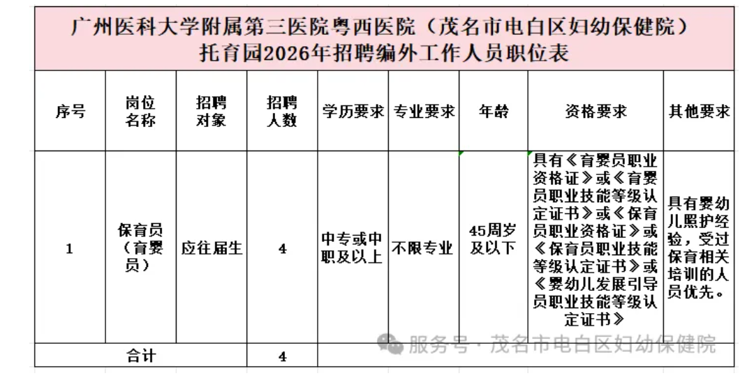广州医科大学附属第三医院粤西医院(茂名市电白区妇幼保健院)托育园是一所环境优美,配套齐全,办学条件优越的普惠性公办托育园。设有全日托、半日托、临时托共约150个托位。现面向社会招聘编外工作人员。现将有关事项公告如下: