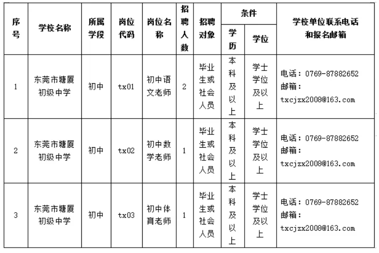 为进一步满足学校教育教学发展需求,由塘厦教育管理中心统招,塘厦初级中学面向全国社会人员或毕业生公开招聘临聘教师4名,其中初中语文2名、初中数学1名、初中体育1名。