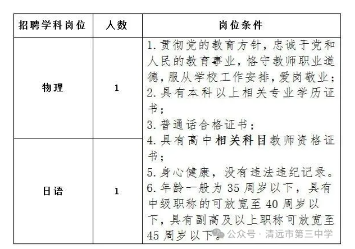 清远市第三中学是清远市教育局直属公办高级中学。因学校发展需要,现面向社会公开招聘临聘物理、日语教师各1名。现将有关事项公布如下: