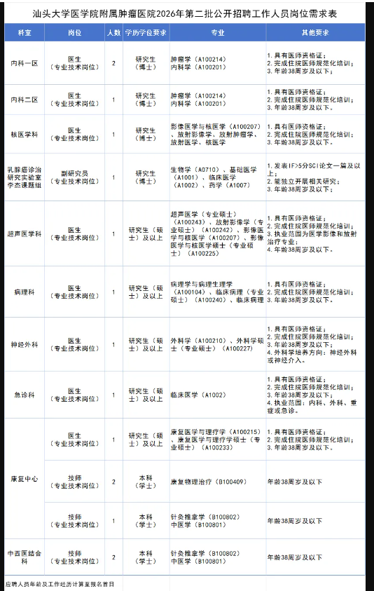 5.具备报考岗位所需其他条件。具体详见《汕头大学医学院附属肿瘤医院2026年第二批公开招聘工作人员岗位需求表》(见附件);面向社会招收的住院医师如为普通高校应届毕业生的,其住培合格当年在医疗卫生机构就业,按当年应届毕业生同等对待。