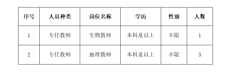 因学校实际用人需求,现招聘专任教师4名。其中,生物教师1名、地理教师3名。