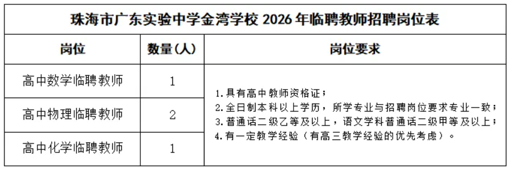为深入贯彻落实“百万英才汇南粤”动计划,加强教师队伍建设,着力推进珠海市教育高质量发展,根据2026年我校人力资源配备的需求实际,现向社会公开招聘临聘教师,2026年3月上岗。具体招聘事项通告如下: