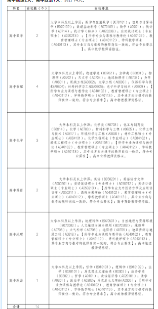 本次拟招聘高中数学2人,高中物理4人,高中化学3人,高中英语2人,高中地理2人,高中政治1人,共计14人。