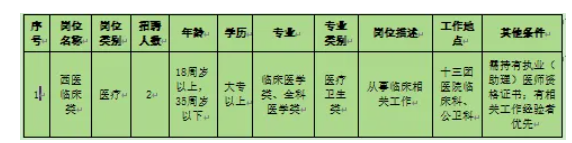 根据十三团医院发展规划,现面向社会招聘,具体事宜如下: