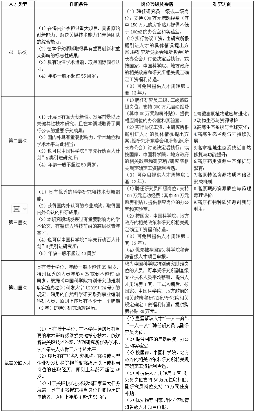 根据西北高原所科研队伍和高原生物学事业发展需求,西北高原所面向海内外诚聘各类人才,主要包括四个层次和急需紧缺人才。
