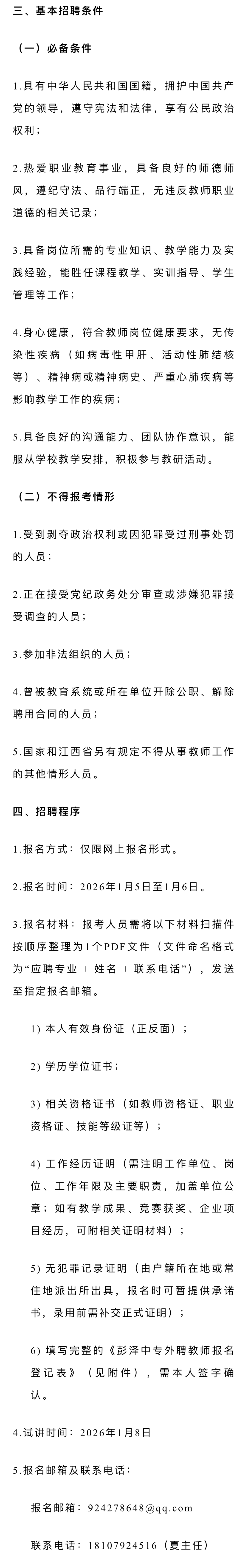 彭泽县旅游工业中等专业学校 2026年外聘教师公开招聘公告