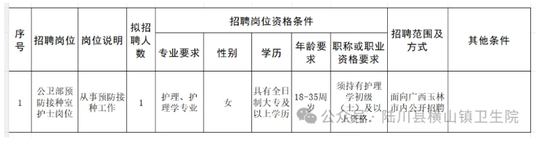 因工作需要,陆川县横山镇卫生院向社会公开招聘编外工作人员。具体招聘事宜如下: