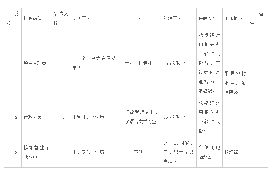 附件:1.平果农村水电开发有限公司公开招聘岗位需求表