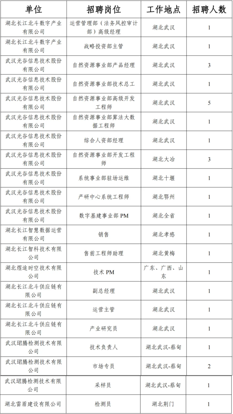 5.招聘岗位学历、专业、年龄、执业资格、职称资格等具体报名条件见附件1《湖北长江北斗数字产业有限公司公开招聘岗位信息》。