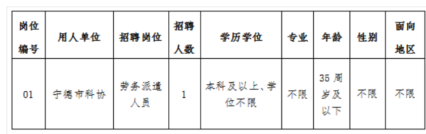 宁德市科技馆为宁德市科协所属事业单位,因工作需要,现面向社会招聘市科技馆劳务派遣人员1名。具体事项如下: