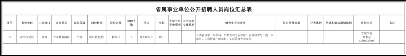 根据事业单位公开招聘有关规定,结合工作需要,济宁医学院管理学院公开招聘博士研究生两名具体岗位及条件详见《省属事业单位公开招聘人员岗位汇总表》(附件1)。
