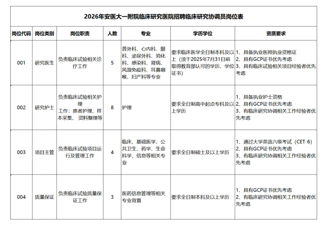 受安徽医科大学第一附属医院委托,为满足安徽医科大学第一附属医院临床研究医院工作需要,安徽易德人力科技股份有限公司承接其劳务派遣临床研究医院的招聘相关工作,拟通过我司招聘临床研究协调员20名,现将有关情况公告如下: