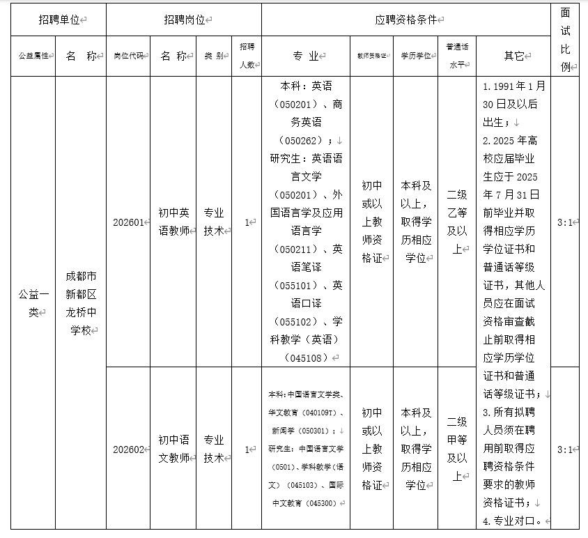 附件1:成都市新都区龙桥中学校2026年面向社会公开招聘编外聘用教师岗位和条件要求一览表