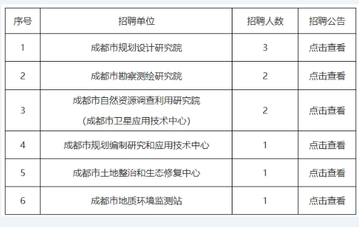 本次公开考核招聘事业单位工作人员涉及成都市规划和自然资源局所属的6家事业单位公开考核招聘工作人员共10名,应聘考生可点击查看各招聘单位的招聘公告、招聘岗位表等信息(见下表)。