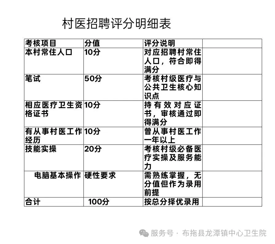为进一步完善辖区村级医疗卫生服务体系,保障团结村、洛觉村、沿江村村民基本医疗与公共卫生服务需求,布拖县龙潭镇中心卫生院现面向社会公开招聘村级医务人员,每村1名,具体招聘事宜公告如下: